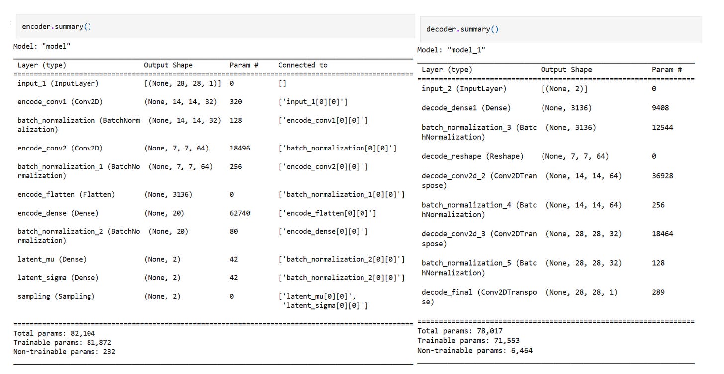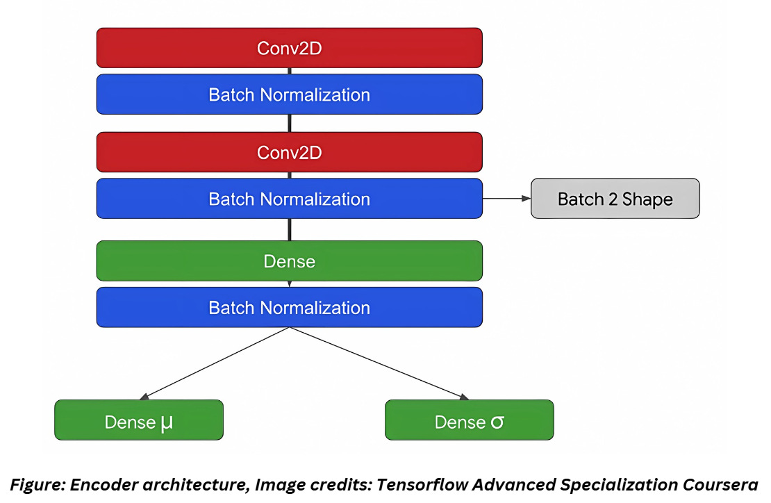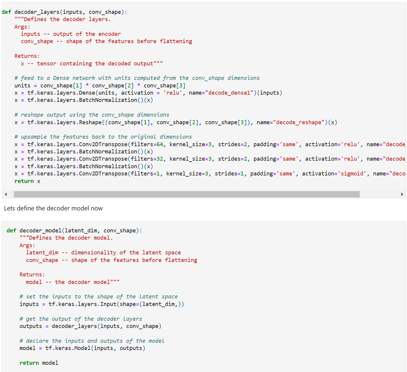 The decoder expands the latent representations back to the original image dimensions. We’ve used a dense layer with batch normalization, two transpose convolution layers, and a single transpose convolution layer with 1 filter to bring it back to the original shape as the input.