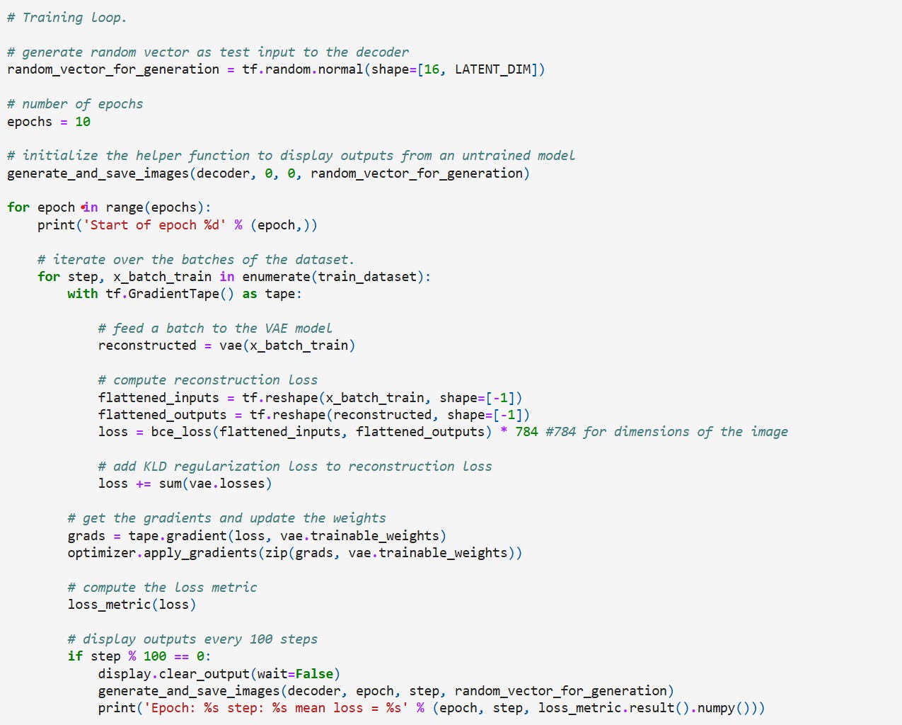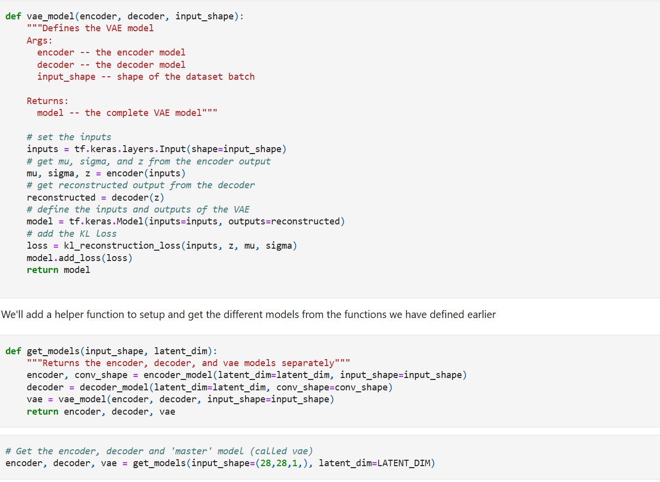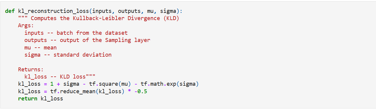 We’ll define a function for KL divergence loss, reconstruction loss while be including in the training loop.