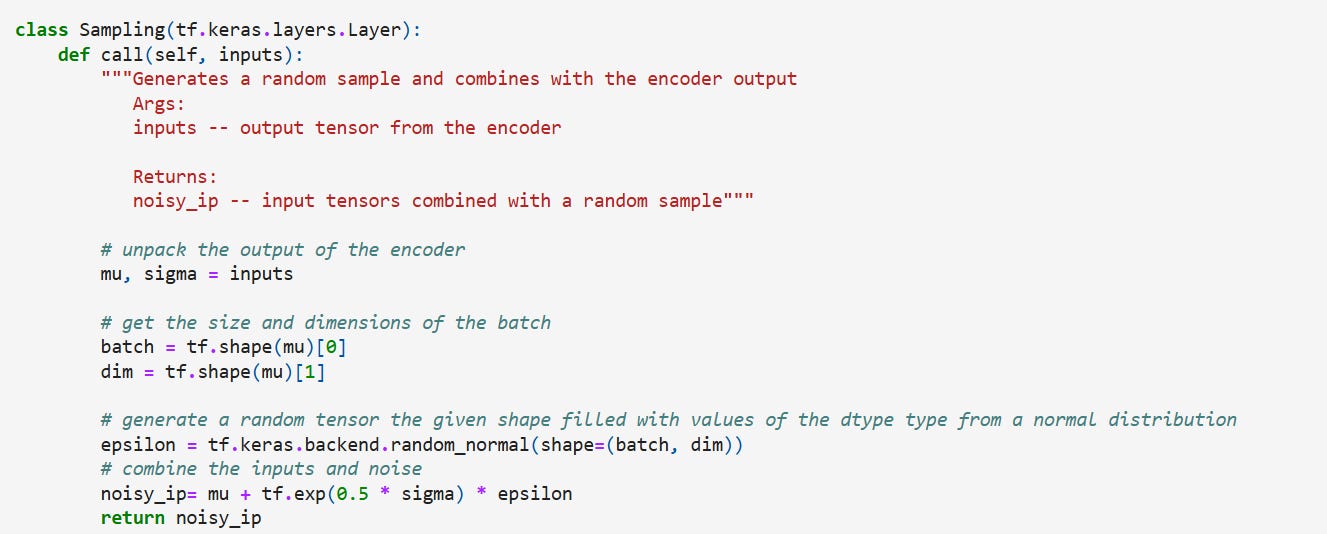 We will begin by building the sampling class which is the bottleneck of the network. This will provide the Gaussian noise input along with the mean and standard deviation of the encoder's output. The output of this layer is given by the equation,