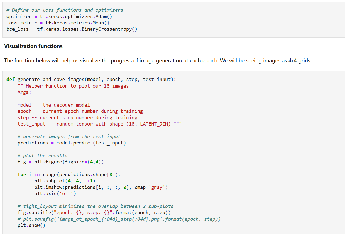 Here we define the reconstruction loss, optimizer, and metric followed by a visualization function to help us visualize the progress of image generation at each epoch. We will be seeing images as 4x4 grids.
