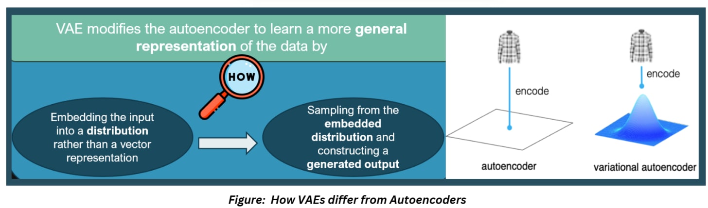 From the above figure, it is obvious what changed in VAEs. The encoder has two outputs in VAEs- the mean of the encoding and the variance of the encoding.