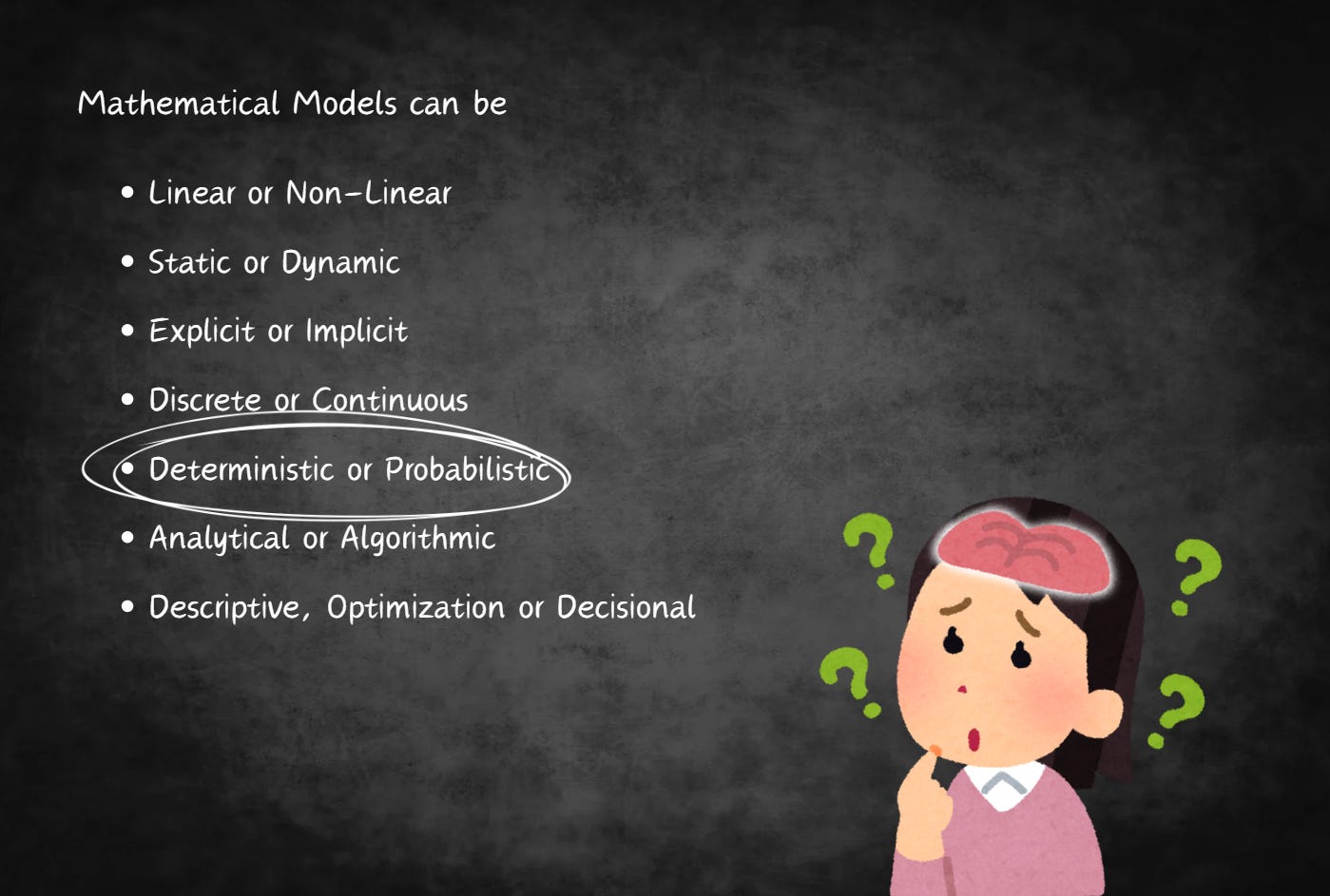 There are different types of mathematical models and how you classify a mathematical model depends on the complexity of the problem, goal, available information (parameters), processes (operations), etc. but the diagram below lists down some of the different categories of mathematical modelling.