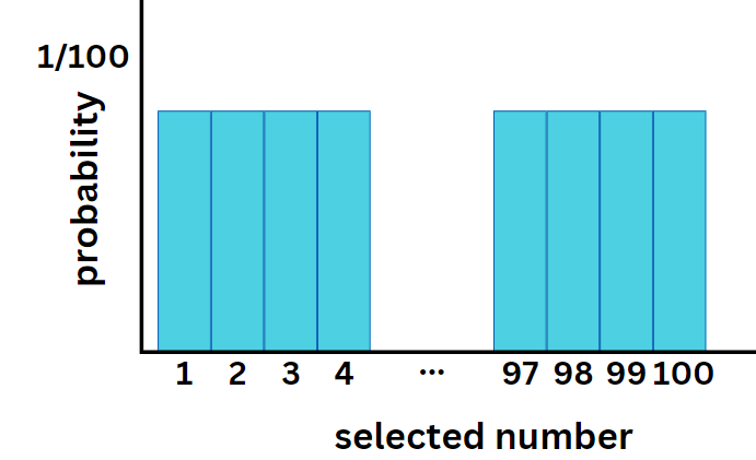 If this game sounds boring and rather lame, then it makes the two of us. But for the sake of proving a point, lets continue. Since your roommate may pick any of the numbers equally, the probability of any one of them being picked up is 1/100. Now you may want to create a graph displaying this information.