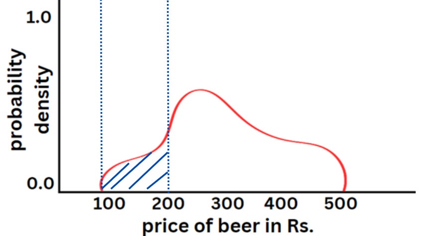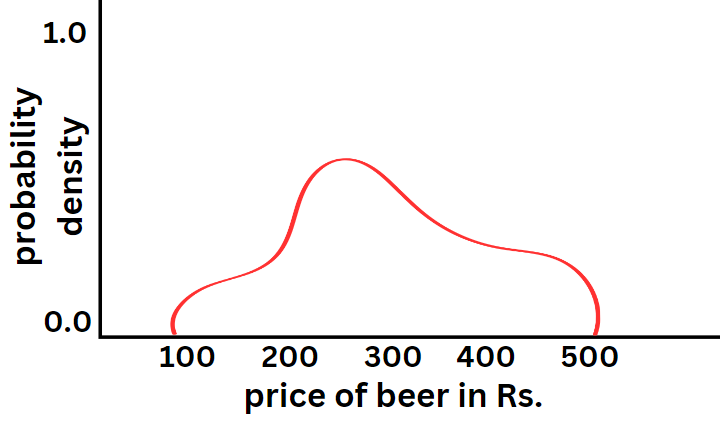 Now let’s say you did win this silly little game of predicting a number and your roommate takes you out for a beer. You head down to the nearest beer shop and your roommate who is picking out a beer for you suddenly turns around with a can of lager (1 pint to be precise) and asks, “Guess how much this costs?”. What will you pick? A pint of beer sold in cans ranges between Rs 100 to Rs 500 depending on brand, manufacturing location, ABV, hops etc. If I start including alcohol tax rates on top of that, giving an exact number is going to be very difficult. Now your roommate considers making it more complicated and says you have to predict the price in Rupees and Paisa and you give up – there are infinite options to consider and you can’t win this one. If you want to put this in a graph, with all the different possible values, the graph will look like the one below. This is an example of continuous probability distribution.