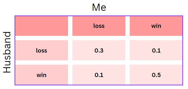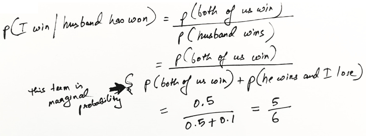Well, there are two ways I can win – either I win and my husband loses or both of us win. The probability of me winning a match after my husband has lost is 0.1. The probability of the both of us winning is 0.5. So marginal probability of me winning = 0.1 + 0.5 = 0.6